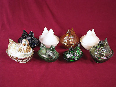 Title (ebay affiliate link): 8 Hazel Atlas Hens, Painted Milk Glass, Amber, Green, Cobalt Glass Shirley Smith