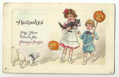 1910 HALLOWEEN BOY GIRL DOG JACK-O-LANTERN ON POLE MAY BE ALWAYS BRIGHT POSTCARD