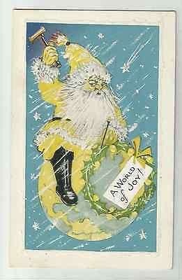 1909 VERY UNUSUAL YELLOW ROBE HAT SANTA NAILS WREATH TO EARTH SITS ON POSTCARD
