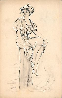Artist~Vintage Bathing Beauty on Post~Ocean Wave Laps Toes~1909 Sepia Postcard