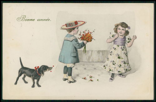 art Child boy girl romance and Dachshund dog original 1910s postcard Vienne type