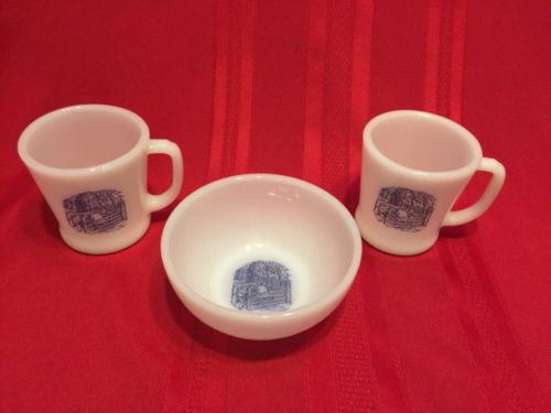Vintage Currier And Ives Milk Glass Mugs Set Of 2 & 5" Bowl CHILDREN ON A FENCE