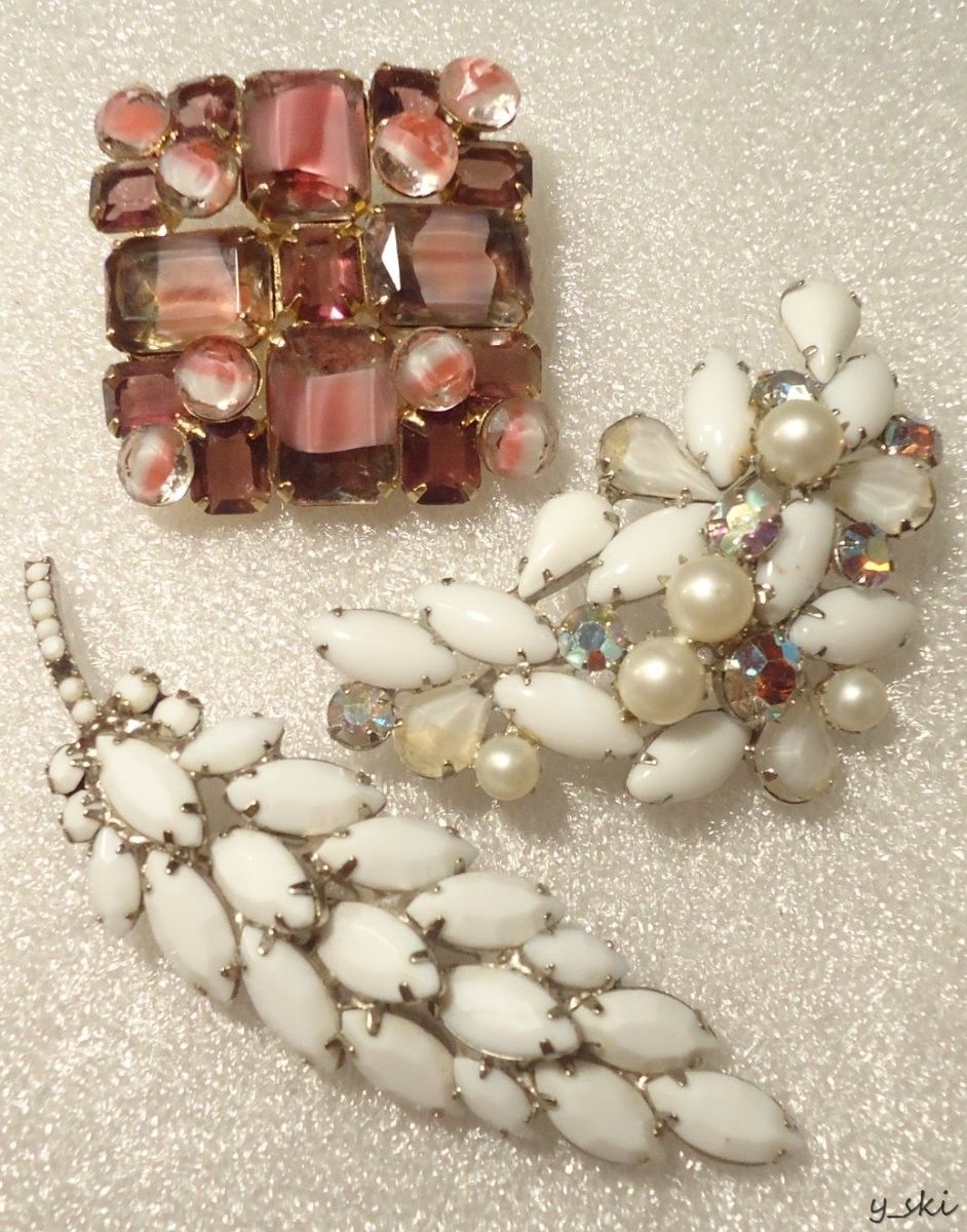 Title (ebay affiliate link): Vintage JULIANA style Pink Givre White Milk Glass Cab AB RHINESTONE Brooch Lot