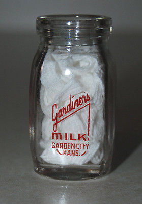 Title (ebay affiliate link): Milk Glass Creamer Bottle GARDINER's DAIRY Garden City Kansas (2 sided print)