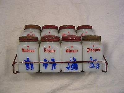 Title (ebay affiliate link): VINTAGE MILK GLASS SET OF SPICE HOLDERS WITH DUTCH MOTIF AND METAL RACK