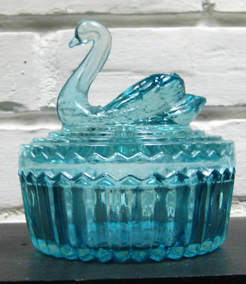 Title (ebay affiliate link): DEPRESSION GLASS JEANNETTE VANITY POWDER BOX/LID SWAN