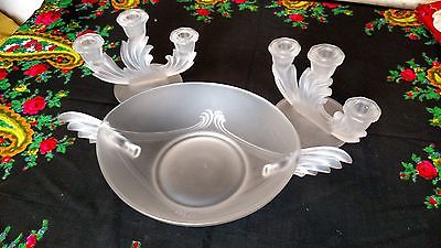 Vintage White Frosted Glass Art Deco Console Set - Bowl and Candle Holders