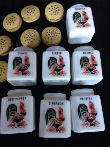 Title (ebay affiliate link): VINTAGE TIPP CITY by McKee Milk Glass ROOSTER SET 7 Spice Jars