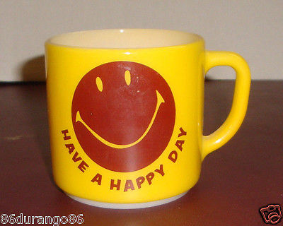 Title (ebay affiliate link): VINTAGE MILK GLASS MUG YELLOW HAVE A HAPPY DAY SMILEY FACE EUC