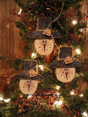 Title (ebay affiliate link): ~5 Primitive Winter SNOWMAN Brr Sign Tag Glittered Wood Christmas Ornie Ornament