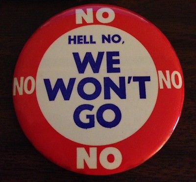Title (ebay affiliate link): Hell No, We Won't Go (Vietnam) Cause PInback Button