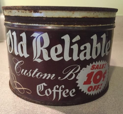 Title (ebay affiliate link): Vintage Old Reliable key wind coffee tin can. Original lid. Nice condition.