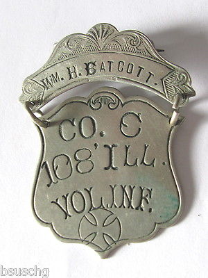 Title (ebay affiliate link): RARE CIVIL WAR SOLDIER NAME BADGE WM CALCOTT COMPANY E 108th ILL VOL INF PEORIA