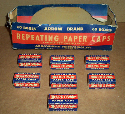 Title (ebay affiliate link): Vintage Arrowhead Fireworks Arrow Brand Repeating Paper Roll Caps 7 Empty Boxes
