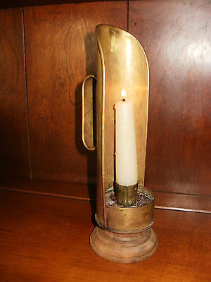 ANTIQUE PRIMITIVE BRASS & WOOD CANDLEHOLDER, CHAMBERSTICK