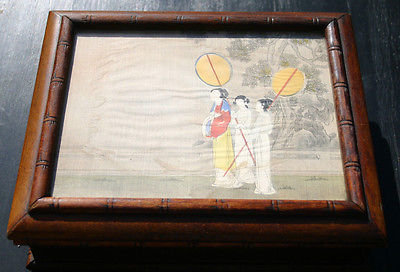 Antique Chinese " BAMBOO" Jewelry Box With Mirror Old Silk print Scene On Front