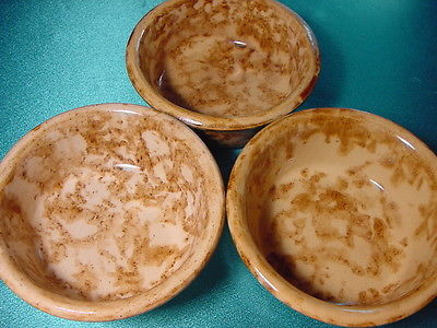Vintage 3 Antique YELLOW WARE 5" Bowls Brown Glaze Sponge Spatter Rockingham USA