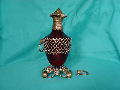 ANTIQUE CRANBERRY RED HUE GLASS PERFUME DRESSER BOTTLE BRASS ORMOLU WORK AS IS