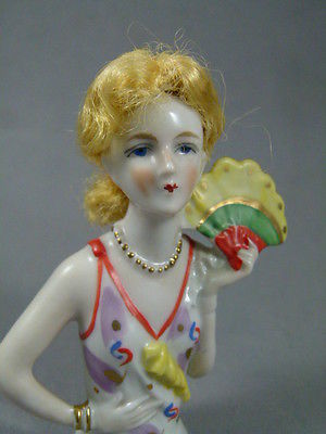 antique German ART DECO HALF DOLL LADY WITH MOHAIR WIG & FAN