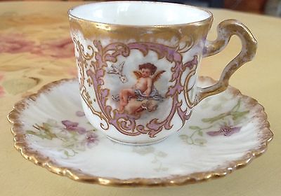 Antique Limoges France Demitasse Cup Saucer Violets Cupid Angel