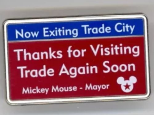 Title (ebay affiliate link): Disney Road Sign - Now Exiting Trade City Thanks For Visiting Mickey Mayor Pin