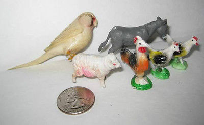 Title (ebay affiliate link): 6 Vintage Miniature Hard Plastic Animals - Parakeet, Chickens, Donkey, Sheep