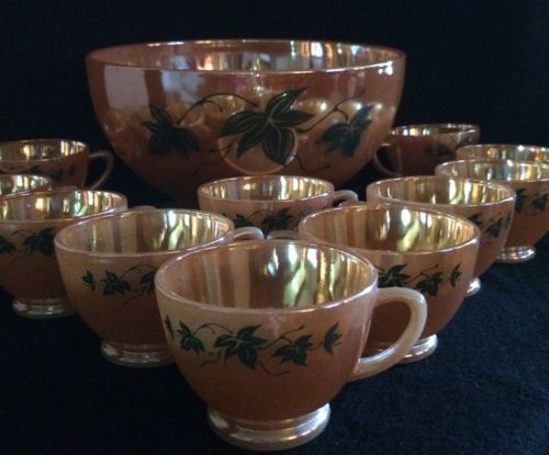Title (ebay affiliate link): 12PC. Iridescent Amber ~ Marigold Punch Bowl Set ~ Cased Milk Glass Carnival