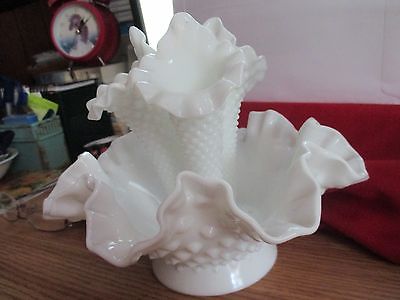 Title (ebay affiliate link): White Milk Glass 3 Horn Epergne Hobnail Tullip Vase Fenton?