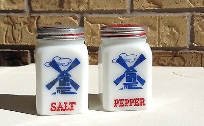 Title (ebay affiliate link): Vintage Windmill Milk Glass Salt & Pepper w/ Advertising/Dike, Iowa