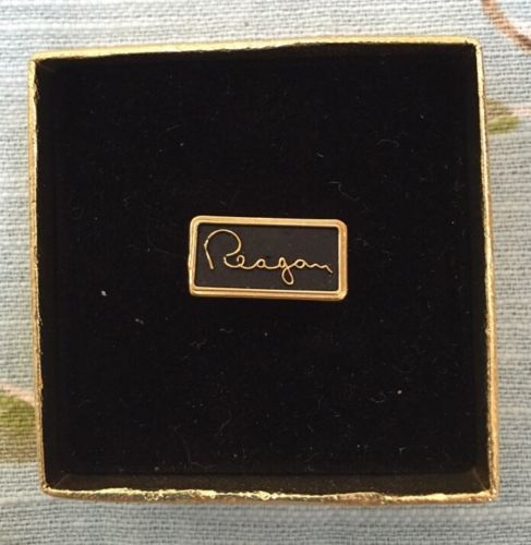 Title (ebay affiliate link): Ronald Reagan "Signature" Campaign Tie Clasp Pin. Original Box Vintage RARE