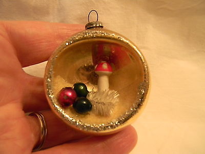 Vintage Glass Christmas Ornament DIORAMA Mushroom Scene Sparkle - JAPAN.