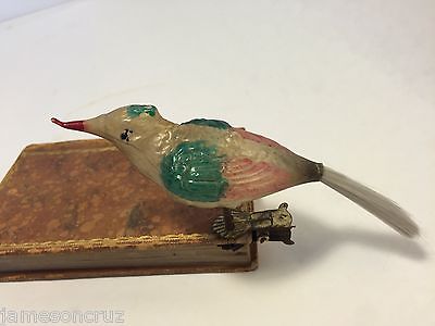Antique German Mercury Glass Bird Green Red Wings Spring Legs Clip On 5.75" Long
