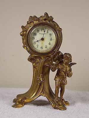 Antique New Haven Figural Clock Art Nouveau Metal Winged Cherub Boy w/ Bird
