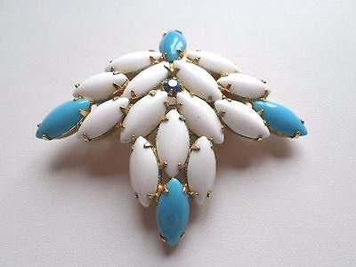 Vintage White and Turquoise Milk Glass Brooch w/ AB Blue Rhinestone