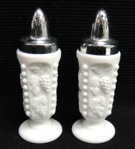 Title (ebay affiliate link): Westmoreland White Milk Glass Salt Pepper Shakers Paneled Grape Pattern Vintage