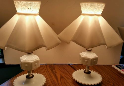 Title (ebay affiliate link): Vintage Pair of Hobnail Milk Glass Table Lamps with Shades, Saucer Bases, Brass