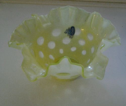 Vintage Fenton Milkglass Yellow Coin Dot Ruffle Edge Rim Glass Bowl Vase 6.5"