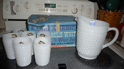 VINTAGE ANCHOR HOCKING 7 PC WATER PITCHER & MILK GLASS HOBNAIL SET NEW IN BOX