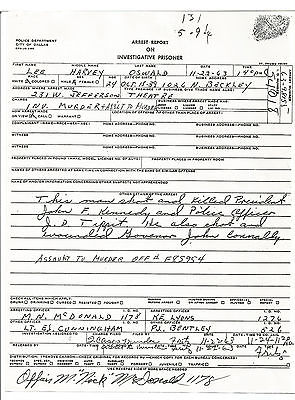 LEE HARVEY OSWALD ARREST REPORT & FINGER PRINTS SIGNED BY NICK MCDONALD OFFICER