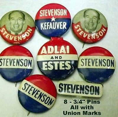 8 3/4" Stevenson & Kefauver Campaign Pins All Genuine Some Unusual
