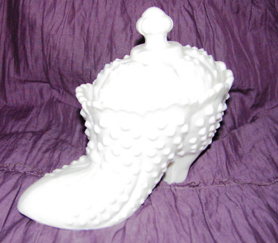 VINTAGE MILK GLASS FENTON HOBNAIL CANDY DISH SHOE W/LID