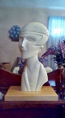 Vintage Art Deco Ivory White Mannequin Head Flapper Bust on Wood Stand