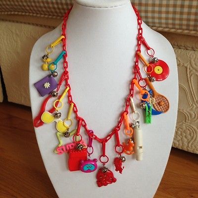 Title (ebay affiliate link): Vintage Retro 80's Charm Clip Necklace Tennis racket Record Whistle wrench star