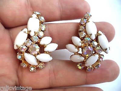 UNIQUE VINTAGE ESTATE JULIANA D&E MILK GLASS AB RHINESTONE CLIP EARRINGS! 3387W