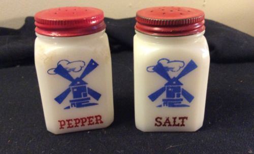 Title (ebay affiliate link): Vintage Hazel Atlas Milk Glass Windmill Salt and Pepper Shakers Red Lids
