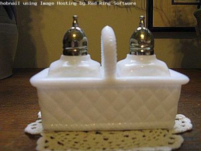 IMPERIAL MILK GLASS SALT AND PEPPER IN PICNIC BASKET