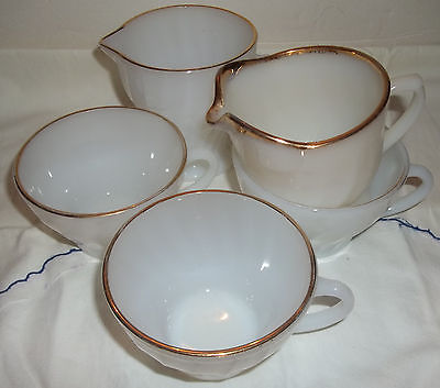 Title (ebay affiliate link): Set of 2 vintage Fire King Gold Rimmed Swirled Milk Glass creamers and 3 cups