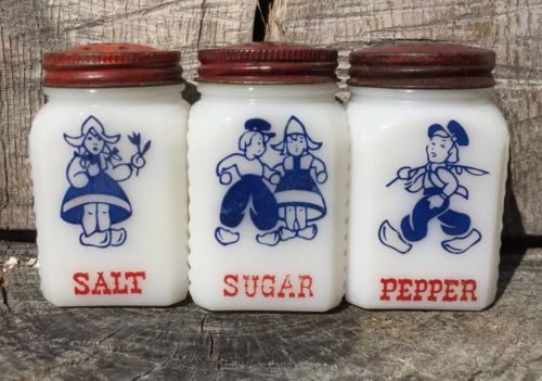 Title (ebay affiliate link): Vintage Dutch Children Milk Glass 3 Range Set Salt Pepper Sugar Shaker Red Top