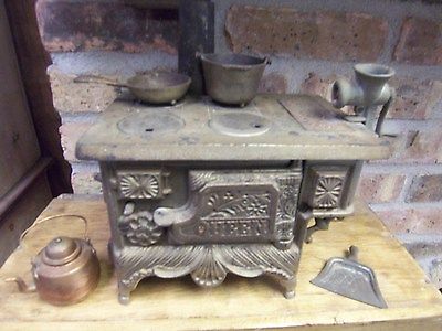 Title (ebay affiliate link): Antique Toy Cast Iron Stove "Queen" Fairly Complete With 5 Accessory Pieces