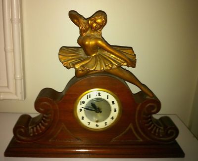 Deco Antique Wood w/ Bronze Ballerina Mantel Clock